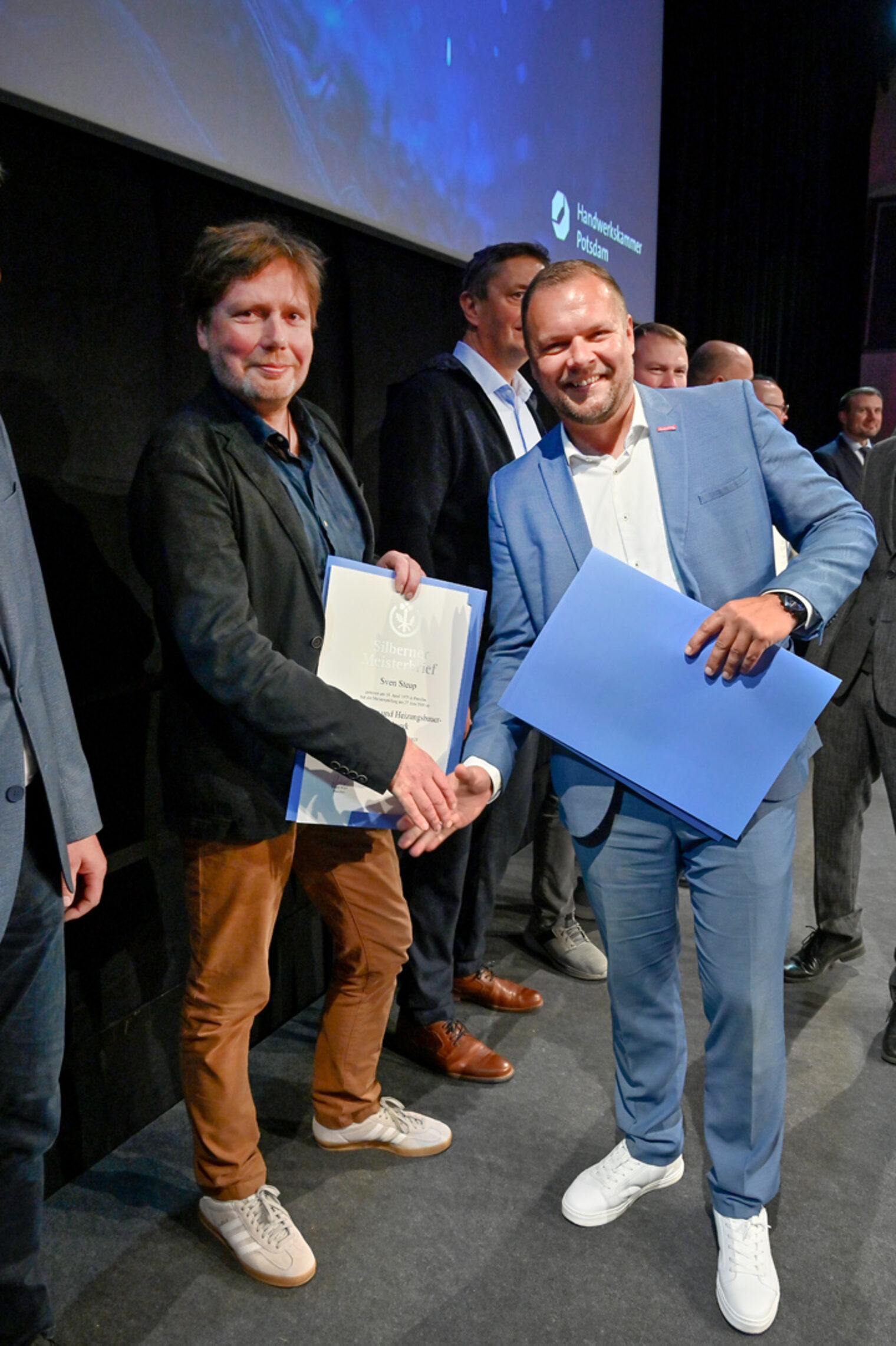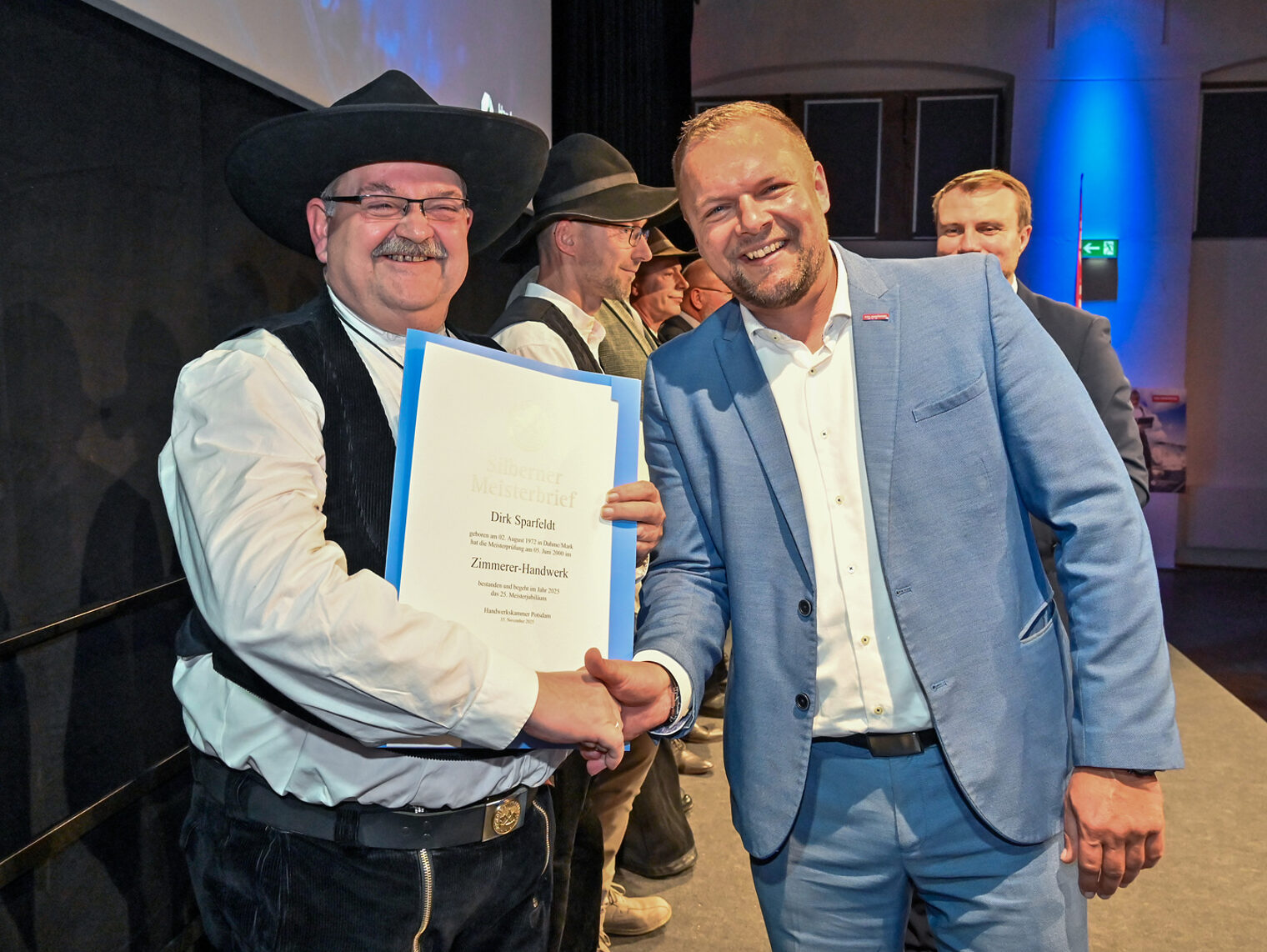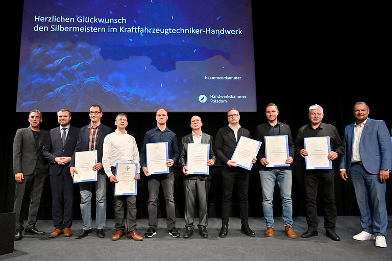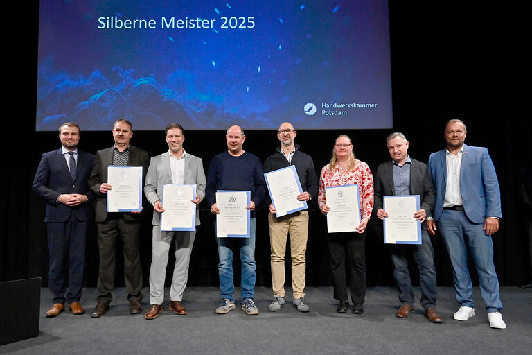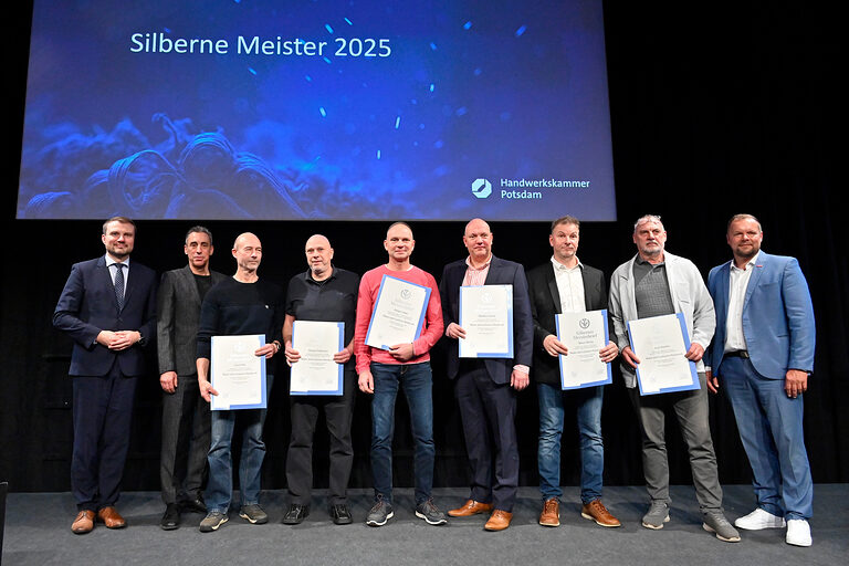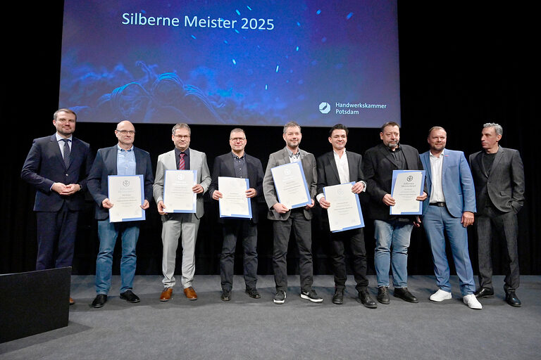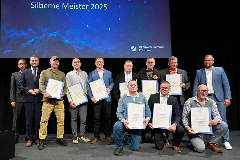 Wenn in der Schinkelhalle Potsdam rund 100 Meisterinnen und Meister aus 19 Gewerken gleichzeitig ihren Silbernen Meisterbrief in den Händen halten, wird sichtbar, was das Handwerk für eine Region leistet. 25 Jahre nach ihrer Meisterprüfung vor der Handwerkskammer Potsdam wurden sie im Beisein ihrer Familien, Gästen aus Politik, Wirtschaft und Partnern des Handwerks am 15. November 2025 als Silbermeisterinnen und Silbermeister geehrt, stellvertretend für 363 Meisterabschlüsse aus dem Jahr 2000. Die Stimmung war geprägt von Anerkennung, Verbundenheit und vielen persönlichen Momenten. Denn diese Meistergeneration gestaltete wesentlich das Werden und Wachsen des Landes Brandenburg mit.