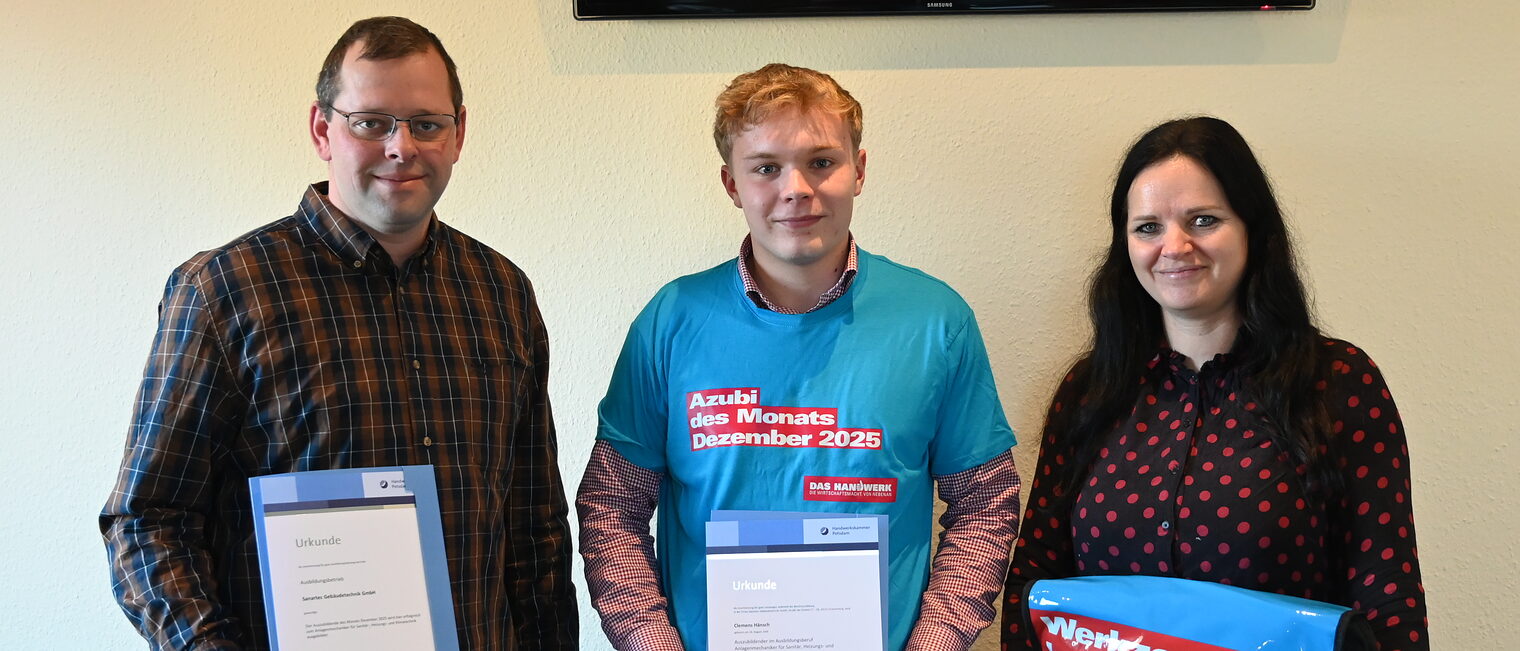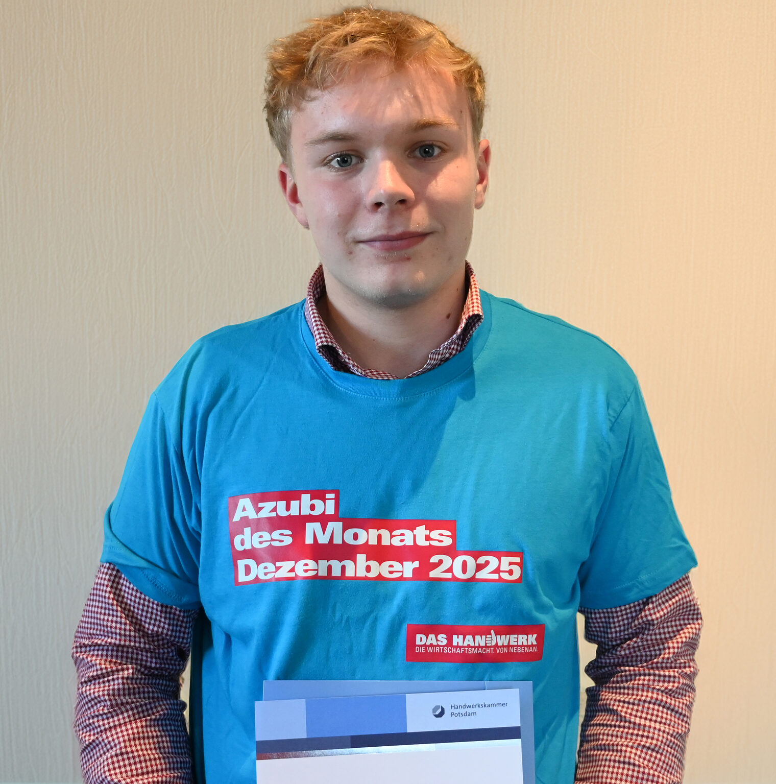 Clemens Hänsch ist der Auszubildende des Monats Dezember im Kammerbezirk Potsdam. Der 19-Jährige erlernt bei der Sanartech Gebäudetechnik GmbH in Oranienburg den Beruf des Anlagenmechanikers für Sanitär-, Heizungs- und Klimatechnik und übt gerade viel für die bevorstehende Abschlussprüfung im Januar. Für seinen Einsatz und seine Zuverlässigkeit wurde er am 15. Dezember 2025 in seinem Ausbildungsbetrieb von Steffi Amelung, Abteilungsleiterin Berufsbildung der Handwerkskammer Potsdam, geehrt.
