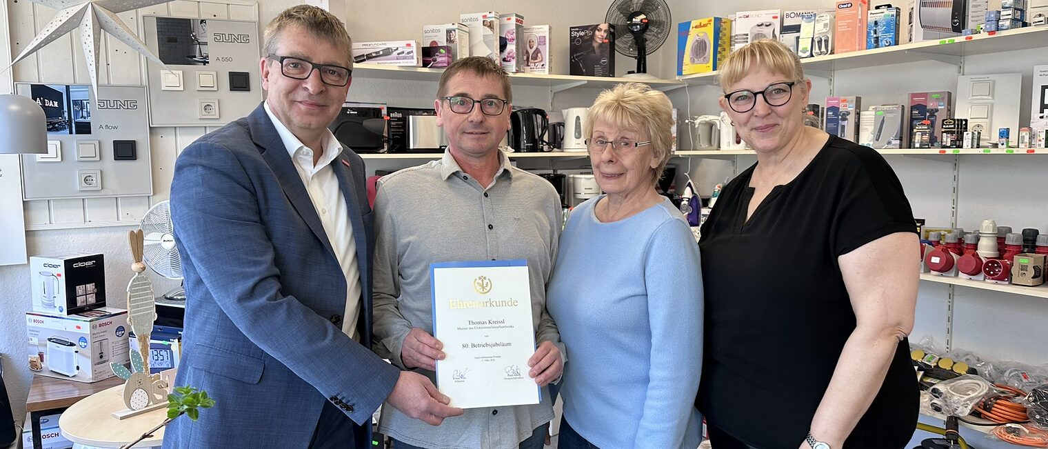 Elektroinstallateurmeister Thomas Kreissl stemmt sich gegen die miese Stimmung mancherorts. Mit seiner fröhlichen und aufgeschlossenen Art begrüßte der Handwerksmeister Hauptgeschäftsführer Ralph Bührig am 17. März in seinem Betrieb in Ziesar. Bührig überbrachte dem Familienbetrieb zum 80. Betriebsjubiläum die Glückwünsche des Handwerks.