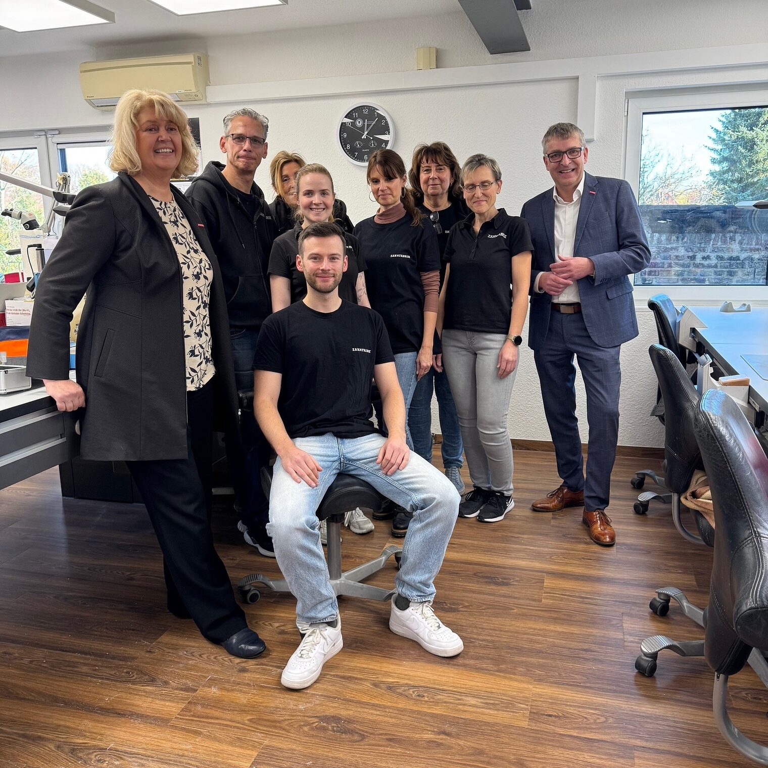 Viel filigraner und gleichzeitig hochmodern arbeiten die Handwerkerinnen und Handwerker im Zahntechniklabor „Zahnfabrik Falkensee GmbH“. Vizepräsidentin Dörte Thie, die selbst ein Labor führt, besuchte gemeinsam mit Hauptgeschäftsführer Ralph Bührig den Betrieb. Auch hier ist erst seit wenigen Wochen ein junger Mann in Verantwortung: Zahntechnikermeister Brandon Lee Ternes führt das 13-köpfige Team am Standort in Falkensee. Dörte Thie warb bei ihm auch darum, sich ehrenamtlich im Handwerk zu engagieren und traf auf großes Interesse.