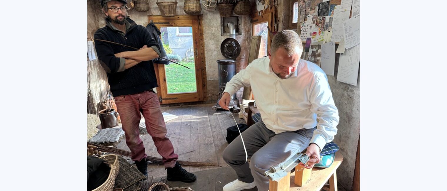 Ein besonderer Höhepunkt war der Besuch des Präsidenten in der Korb- und Flechtwerkmanufaktur „Die Weiderei“ in Havelaue. Dort, im Nordwesten des Landkreises und rund 70 Kilometer westlich von Berlin, arbeitet Benjamin Nauleau, der sein Korbflechterhandwerk in Frankreich vom Vater und Großvater erlernte. Robert Wüst ließ sich von ihm einige Handgriffe zeigen – spalten, hobeln und schälen gehörten dazu.