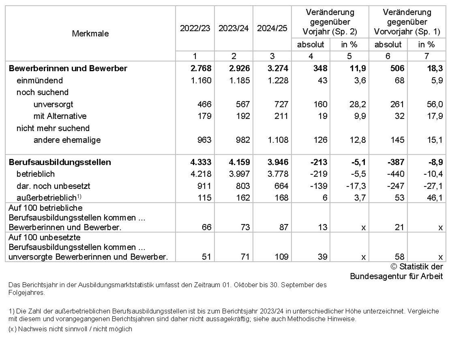 Im abgelaufenen Berufsberatungsjahr vom 01.Oktober 2024 bis 30.September 2025 haben 348 junge Menschen mehr nach einem Ausbildungsplatz gesucht, als im Vorjahr. Insgesamt standen 3.274 Bewerberinnen und Bewerber 3.946 gemeldete Stellen gegenüber.