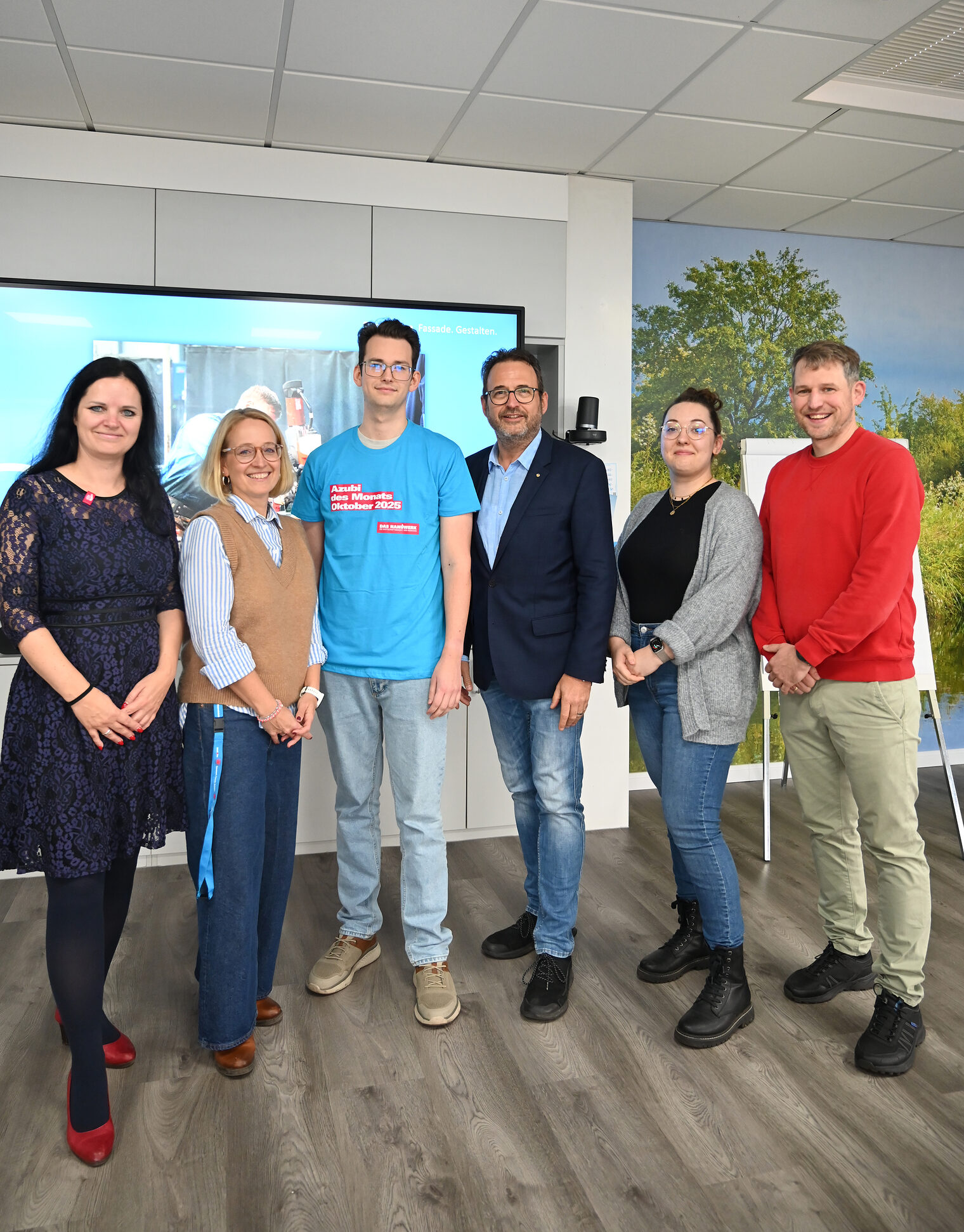 Steffi Amelung, Handwerkskammer Potsdam, Windeck-Personalchefin Sandra Damaschke, Roman Seyfarth, Geschäftsführer Oliver Windeck, Lina Brandt ist technische Systemplanerin und bildet Roman gemeinsam mit Konstrukteur Bastian Perlbach aus (v.l.).