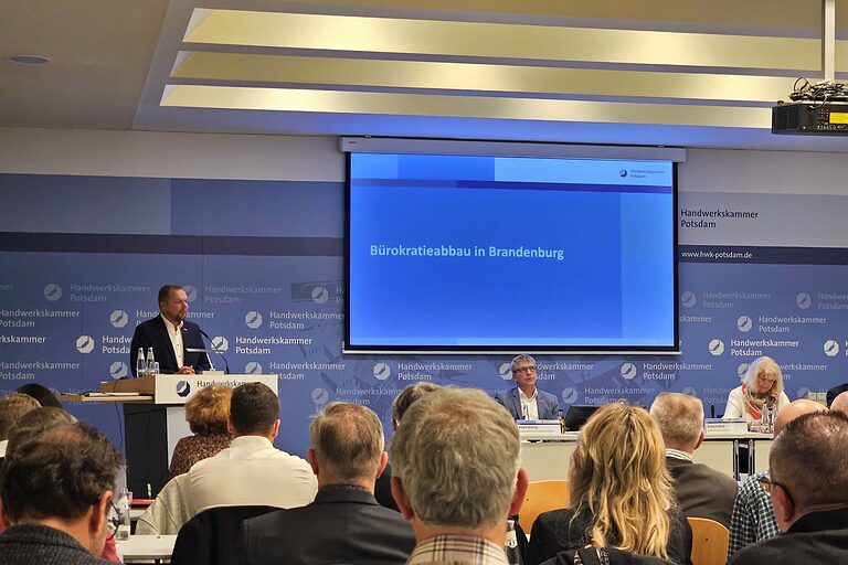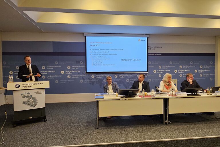 Besondere Aufmerksamkeit erhielt der Gastvortrag von Dr. Hendrik Voß, Referatsleiter Berufliche Bildung beim Zentralverband des Deutschen Handwerks. Anhand der Deutschen Meisterschaft im Handwerk – German Craft Skills, der EuroSkills 2025 in Herning (Dänemark) und der Wettbewerbe 2027 im Gastgeberland Deutschland zeigte er, welche Bühne Berufswettbewerbe der dualen Ausbildung bieten. Deutlich wurde dabei auch: Wenn junge Handwerkerinnen und Handwerker aus Deutschland und damit auch aus dem Kammerbezirk Potsdam in diesen Formaten antreten, ist dies auch ein deutliches Signal für die Qualität der Ausbildung in den Betrieben.