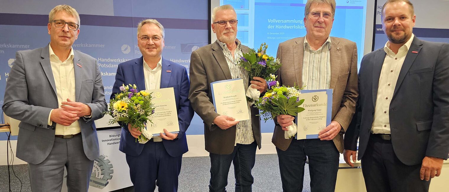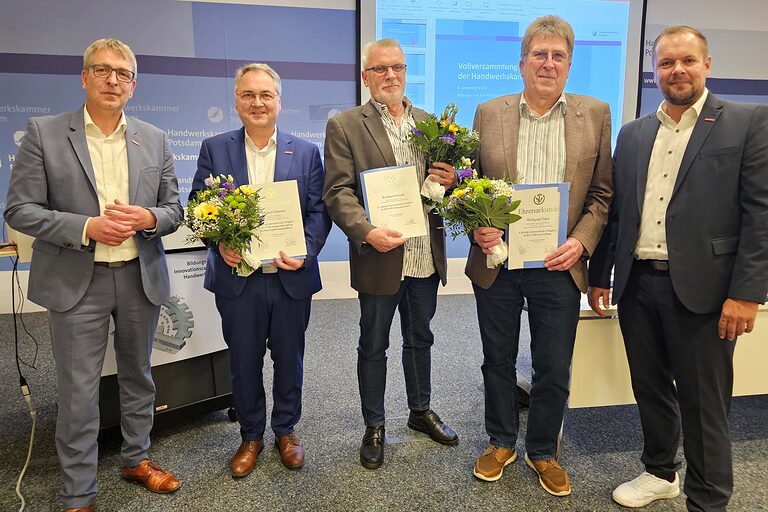 Mit der Verabschiedung von Eckel, Ziesecke und Porazik würdigte die Vollversammlung drei Ehrenamtliche, die Selbstverwaltung im Kammerbezirk Potsdam über viele Jahre mit Leidenschaft für ihre Branche und Leben gefüllt und Entscheidungen aus der Praxis heraus mitgestaltet haben.