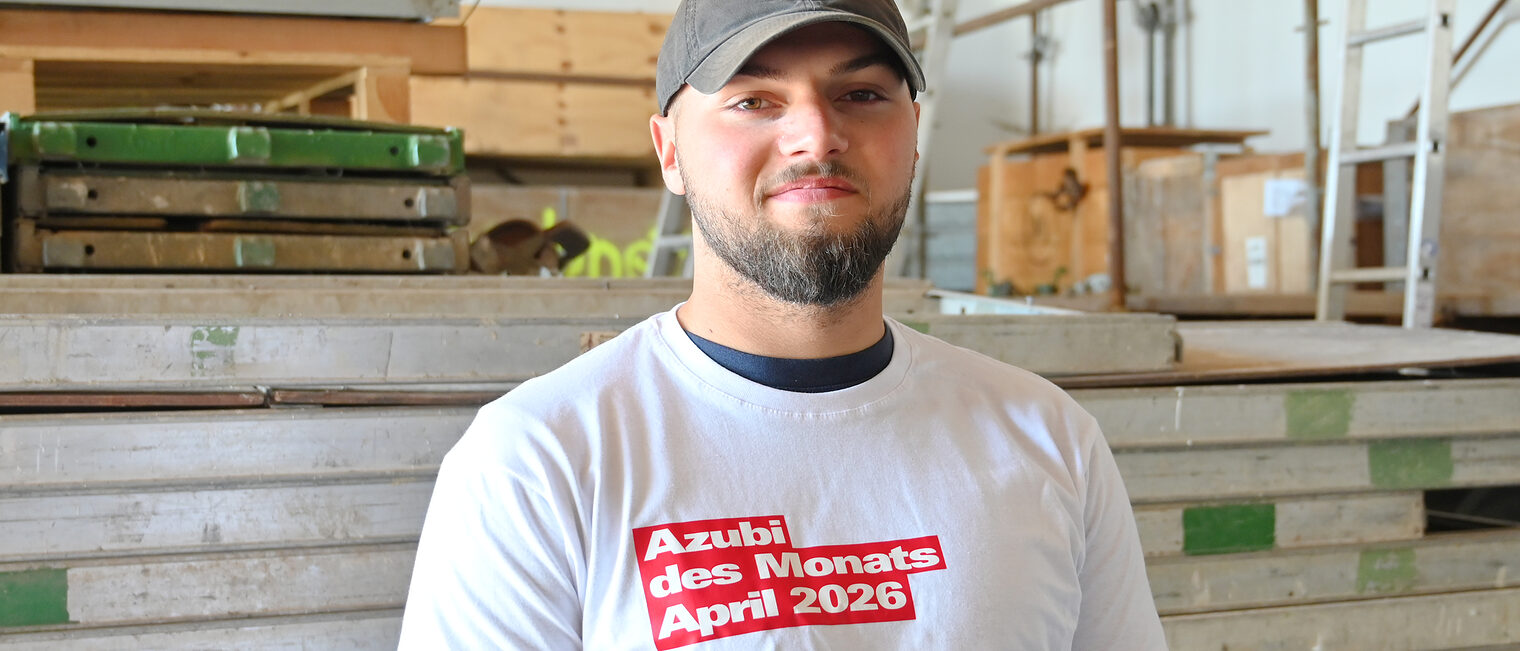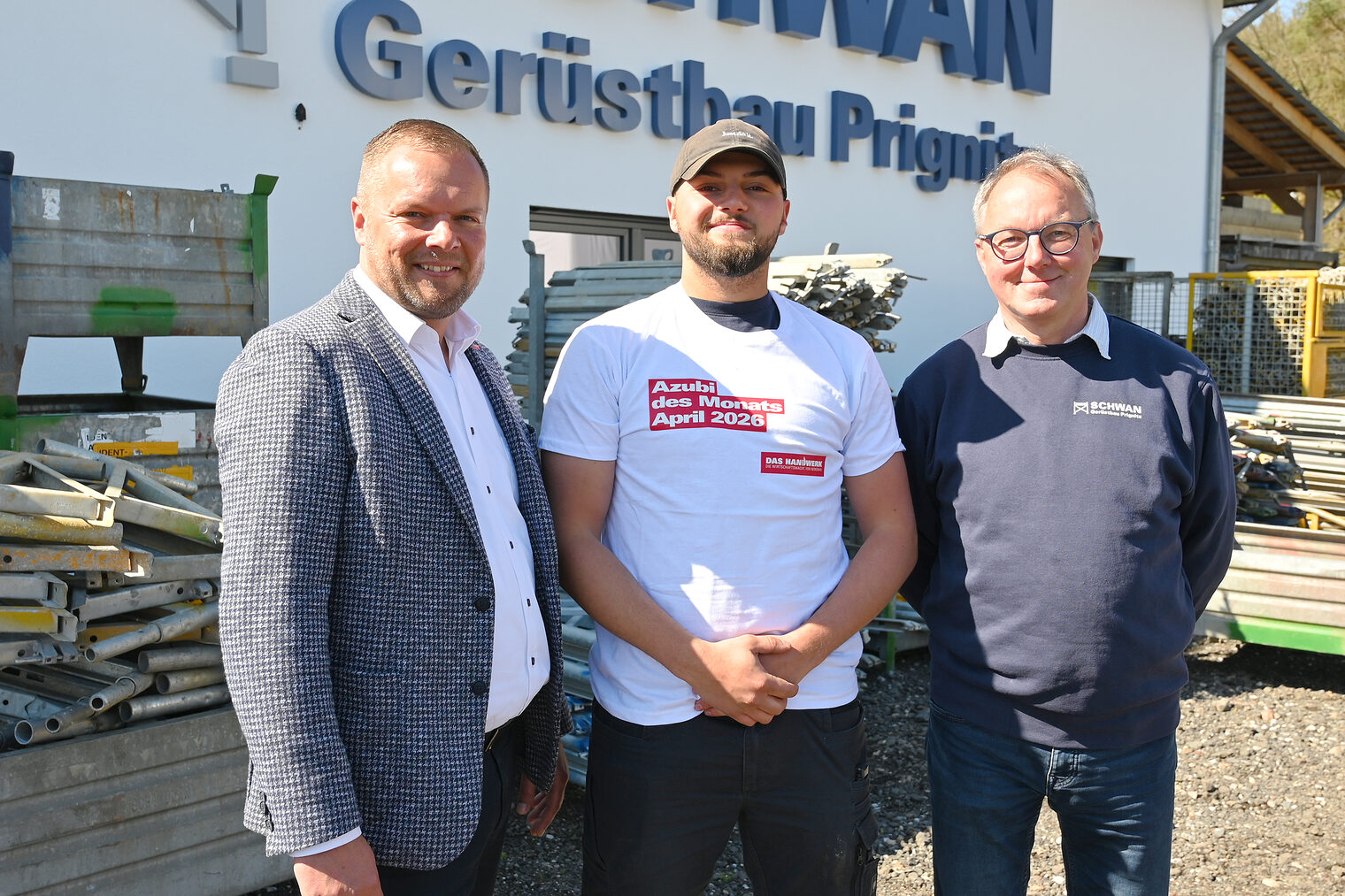 Am 21. April 2026 zeichnete Handwerkskammerpräsident Robert Wüst Gerüstbauerlehrling Eric Quintin Schlede als Auszubildenden des Monats April aus. Der 19-Jährige absolviert seine Ausbildung zum Gerüstbauer in der SGB Schwan Gerüstbau Prignitz GmbH in Wittenberge. Dort kam fast das ganze Team zusammen, um bei der Überraschung für Eric dabei zu sein.
